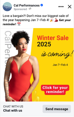 ASYMM Digital partnered with Cal Performances to promote their 2025 Winter Sale campaign, delivering record-breaking results. The campaign featured a multi-channel strategy, kicked off by a pre-sale teaser campaign leveraging a standout activation on Facebook Messenger ads that played a pivotal role in engaging new audiences and expanding reach.